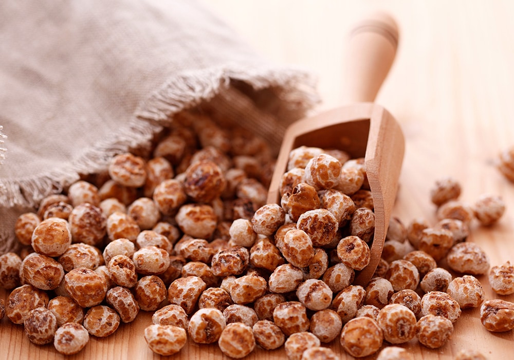 Tiger nut milk is a creamy and nutritious dairy alternative made from blending tiger nuts with water. Tiger nuts, also known as chufa, yellow nutsedge or earth almonds, are not actually nuts, but rather edible tubers. They are the size of a chickpea but wrinkly with a chewy texture and sweet nutty flavour like coconut. They were one of the first plants cultivated in Egypt and traditionally used as both food and medicine. They make a brilliant nut milk and are rich in a variety of nutrients including fibre, vitamin E, magnesium and potassium, helping to keep you feeling fuller for longer and maintain healthy digestion.