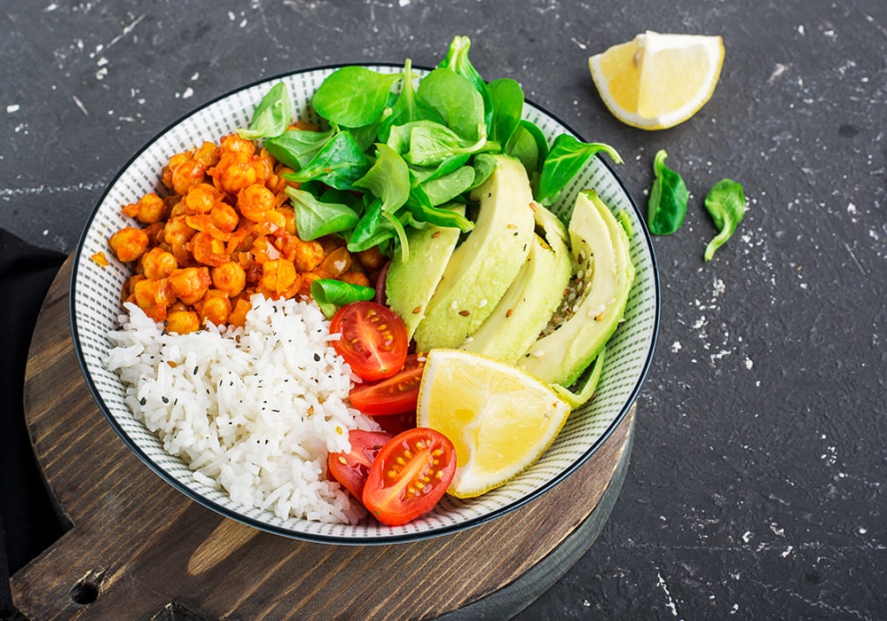 - Quinoa salad with chopped veggies, chickpeas, and a lemony dressing.