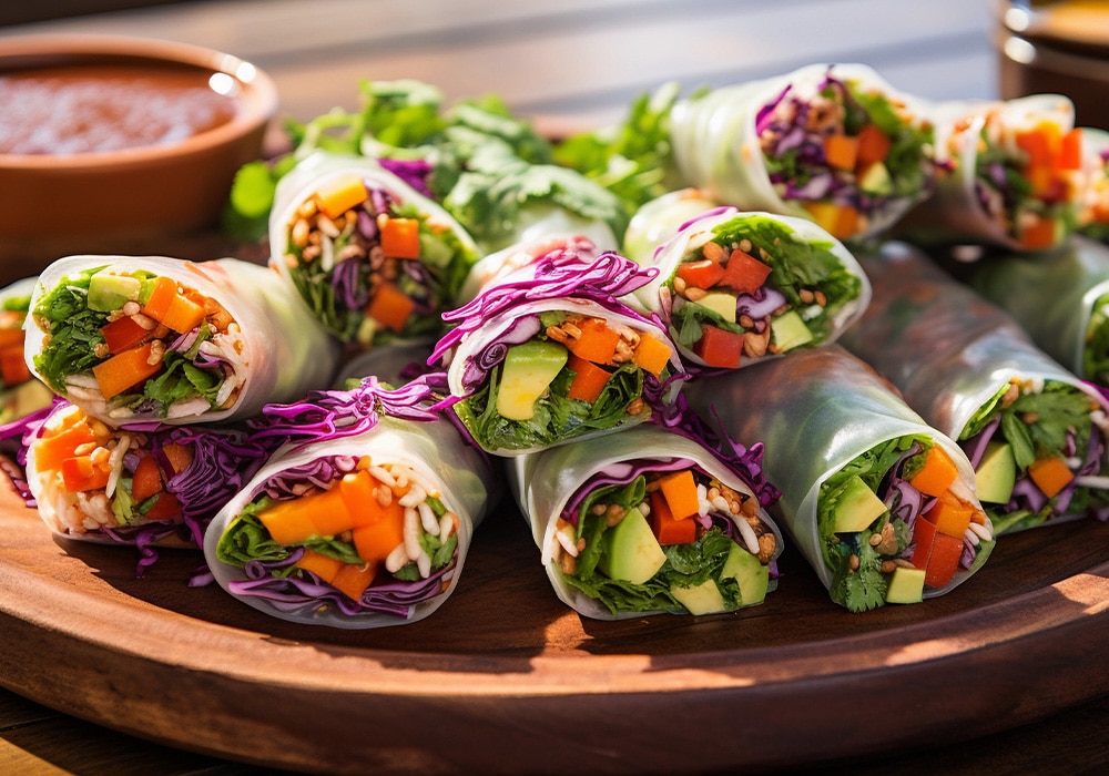 - Rice paper rolls filled with rice noodles, avocado, cucumber, grated carrot and shredded lettuce.