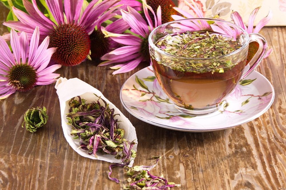 Echinacea tea is a popular way to take the herb. Add 1 teaspoon of dried echinacea root to 1 cup of boiling water. Let the mixture steep for 15 minutes, then strain. Drink 1 – 3 cups per day.
